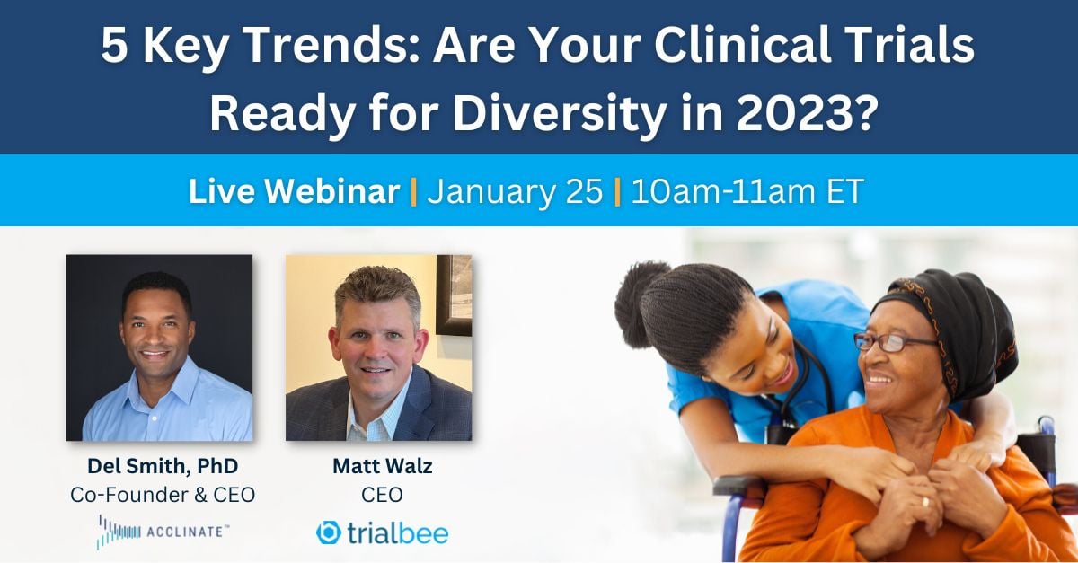 Trialbee and Acllinate will present an informational webinar discussing 5 key trends in diversity for clinical trials in 2023. The webinar aims to provide insights on how to make clinical trials more inclusive and ready for diverse populations. The webinar will be hosted by Trialbee and Acllinate, two companies with expertise in patient recruitment and community engagement for clinical trials for diverse populations.